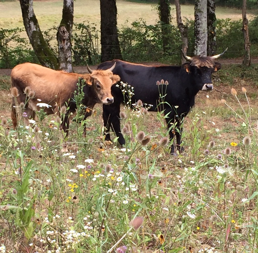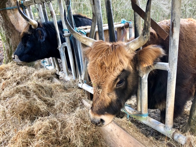 Avec un peu de chance, vous pourrez apercevoir les deux nouvelles pensionnaires de nos prés ; d’élégantes Aurochs. Ces vaches à l’allure préhistorique font revivre une espèce primitive disparue il y a 400 ans environ. Elles contribuent, à leur rythme, au maintien des sous-bois et nous rappellent que les terres seigneuriales étaient, avant tout autre chose, des terres d’élevage et d’agriculture.